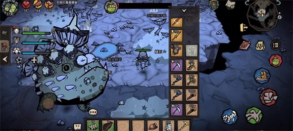 苦难蟾蜍:这只蟾蜍相当棘手,建议等游戏后期再尝试挑战。挑战前需备好8套铥矿装备、15件强力武器、10根火把、20份回血食物、1个传送锚点、1只金丝雀(用捕鸟笼捕捉)和1个空笼子。召唤步骤如下:先前往地下区域,寻找被三个水池环绕的紫色巨型蘑菇——这样的Boss点共有三处,蟾蜍会随机出现在其中一个点。找到目标蘑菇后,将空笼子放置在地面,把金丝雀放入笼中,等待一段时间,金丝雀会出现中毒反应。此时用锤子敲碎笼子,将中毒的金丝雀丢到紫色大蘑菇附近,片刻后金丝雀会发生爆炸,紫色蘑菇随之变为淡黄色。最后用斧头砍伐这棵淡黄色蘑菇,苦难蟾蜍就会被召唤出来。战斗时,若场上蘑菇树数量较少,可直接集中火力攻击蟾蜍;若蘑菇树大量滋生,则用火把焚烧清理。蟾蜍移动速度较慢,技能也容易躲避,通常持续消耗约两小时即可将其击败。若战斗陷入困境,直接退出当前地图即可,Boss状态不会因此重置。