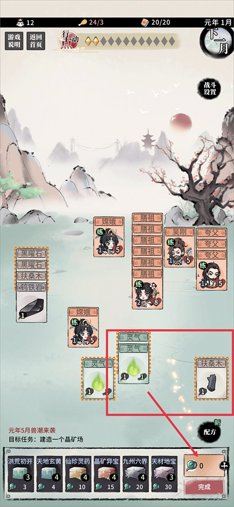 ㉒升仙台:人物3个,仙木3份,太玄石3块,百炼钢2份,广寒铁2块,晶玉2颗,行动点3点