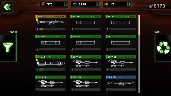 武器可以从两个维度划分:按功能看,包含机枪、火箭炮、重型狙击枪等类型;按使用载体分,则有机载和人载两种——机载是你直接操控的武器,人载就是四个步兵携带的装备。 这里有两个核心建议:首先,务必留一把机载机枪重点培养,哪怕它初始成色一般(比如是绿色品质的过渡款),也要把它养成5星左右的能用状态,不用纠结原因,照做就行;其次,步兵携带的武器里,至少要有一把像样的霰弹枪。如果前期开箱没拿到好的霰弹枪,先捡一把基础款的破霰弹枪用着、慢慢发展,等后续遇到优质霰弹枪时,再把这把破的当成融合材料就行。 总结下来就是:机载机枪和人载霰弹枪,这两类至少各要有一把能打的。