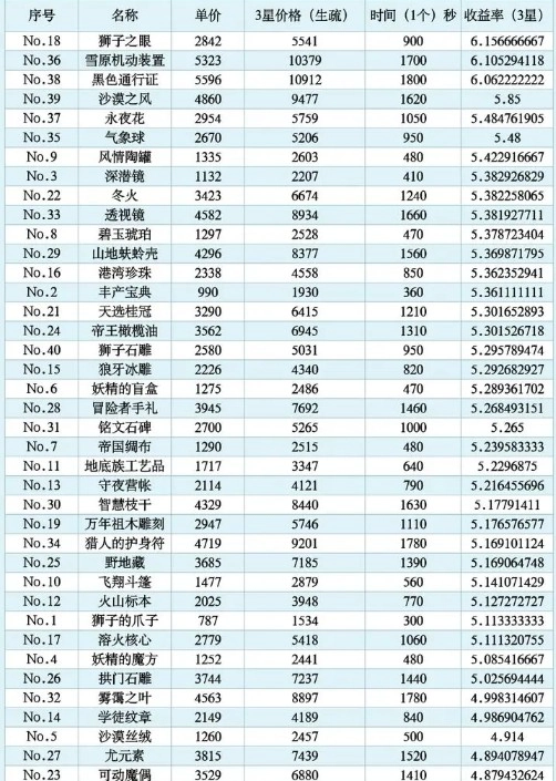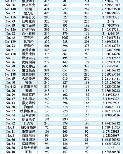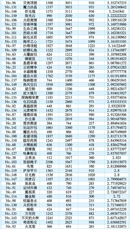 新增:npc喜爱配方收益表。