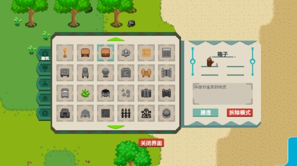 点击建筑可进入建筑面板,在面板中选择想要打造的物品(例如箱子),系统会显示该物品的建造所需材料,点击“建造”按钮就能完成制作。