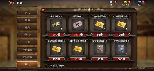 赠送道具的操作步骤和赠送坦克是相同的,在赠送道具界面中,你可以选择赠送指挥官改名卡、军团改名卡、高级账号体验卡以及赛季积分卡,并且能够自由挑选想要赠送的道具呢~