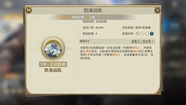 二技能的选择上,这里可以搭配撞阵冲军或者乘胜追击。撞阵冲军的效果是前两回合有概率让普攻多攻击一次,乘胜追击则是普攻后有概率追加一次攻击,同时降低敌方的攻防属性。这里更推荐撞阵冲军,原因是它的发动概率达到60%,而乘胜追击只有25%。除此之外,还有一张强攻猛打的技能,能对单体造成3段伤害,发动概率为30%。