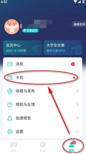 打开软件后,先点击“我的”板块,接着点击“卡包”进入。