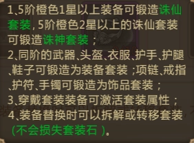 玩法说明 - 锻造规则:五阶橙色1星及以上的装备能够锻造为诛仙套装,而五阶橙色2星及以上的诛仙套装则可以进一步锻造为诛神套装。