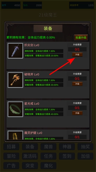 在装备界面找到红色箭头所指的烬炎剑,点击其旁的升级按钮,消耗相应资源即可提升装备等级,从而为穿戴者带来全体战力加成。