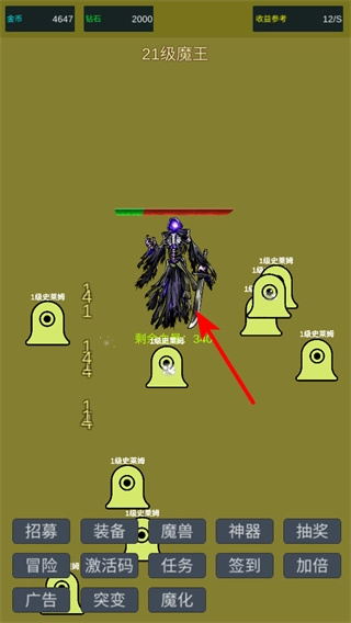 在游戏里按照红色箭头的提示,点击21级魔王的形象所在区域,就能触发史莱姆单位对魔王发起攻击,此时界面会显示出当前剩余的伤害数值。
