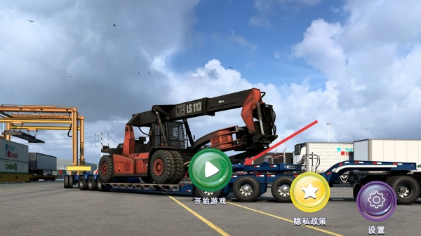 点击【开始游戏】按钮后,先选择叉车任务,进入港口场景熟悉各项操作;通过摇杆控制方向,借助按键完成叉车的装卸货动作,将集装箱精准放置到指定位置,从而完成基础运输任务。