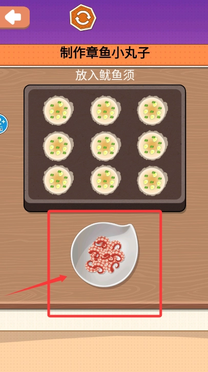 选好关卡后,先在铁板上刷一层食用油,把调好的面糊倒进去,接着再把新鲜的章鱼须均匀地铺在上面。