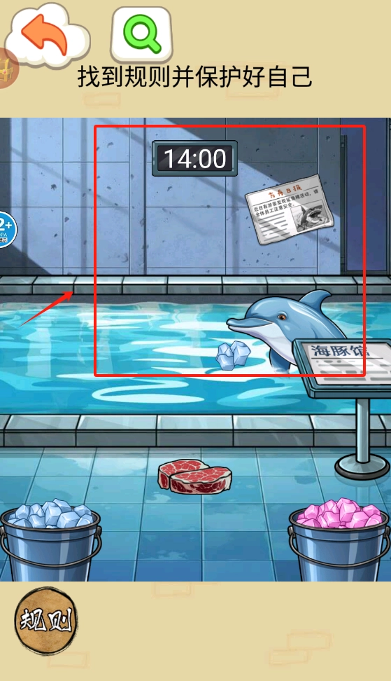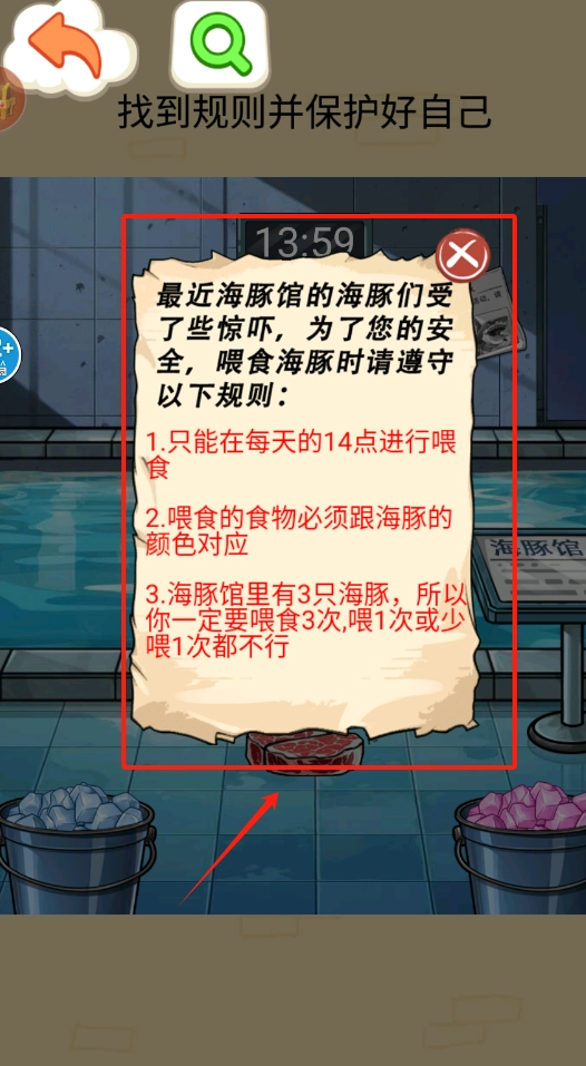 阅读告示了解喂食规则:每日14时进行喂食,投喂的食物颜色需与海豚相匹配,且必须喂食3次。