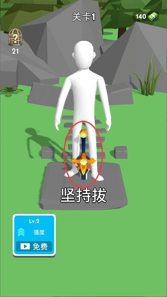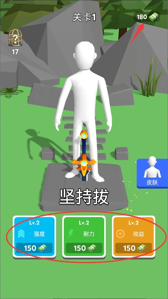 成功拔出圣剑能得到金币奖励,攒够金币可以提升力量属性,之后的关卡拔剑会更轻松高效。
