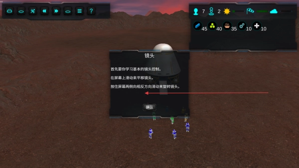 进入星球基地游戏后,按照提示在屏幕上滑动以移动镜头,按住屏幕两侧并向相反方向滑动可旋转镜头,熟悉操作后点击确认即可。