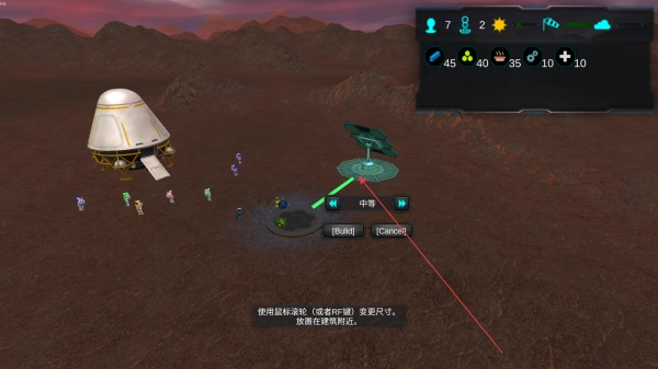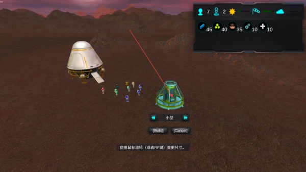 看到飞船和小人后,可通过鼠标滚轮或RF键调整建筑尺寸,选择合适大小(比如小型建筑)进行放置。