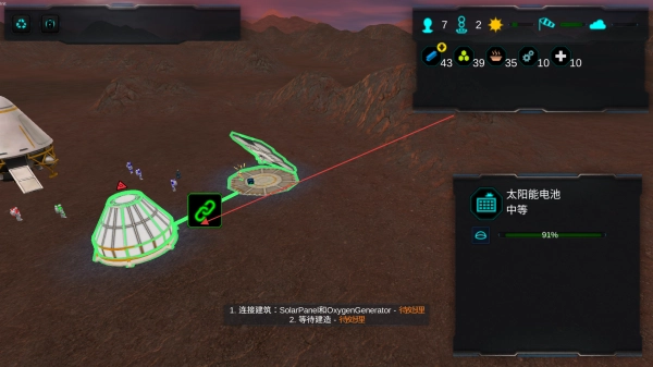 放置好建筑后,根据提示将建筑连接起来,比如把太阳能板和制氧机相连,然后等待设施开始运作。