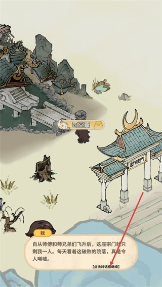 当处于宗门场景的对话界面时,在看到司空翼的互动内容后,点击对话框继续,以此推进剧情,了解宗门当前的具体状况。