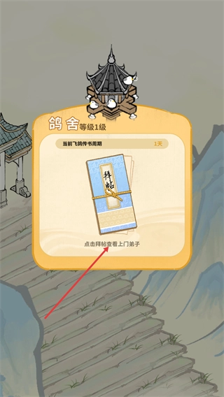 进入鸽舍界面后,能看到该建筑目前处于1级状态,飞鸽传书的间隔周期是1天。点击界面里的拜帖选项,就可以查看前来上门的弟子,这一操作是获取弟子的重要关键步骤。