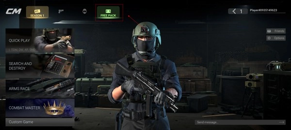 打开战斗大师应用,进入主页后,点击下图中标注为“FREE PACK”的礼包按钮。
