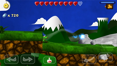 如图右下角所显示的,那个带有魔法弹图标的按键就是魔法攻击键,点击它就能发起魔法攻击。画面右上方是魔法能量条,一旦蓝色能量条数值变为0,玩家就没办法施展法术了。不过能量条会随着时间推移自动补充能量,另外,玩家也能在游戏里收集小蓝瓶来直接把能量条补满。