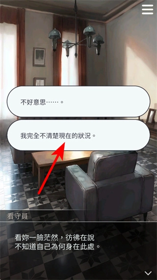 选择红色箭头所指的对话选项,比如“我完全不清楚现在的状况”,和角色展开互动,以此推动剧情发展。