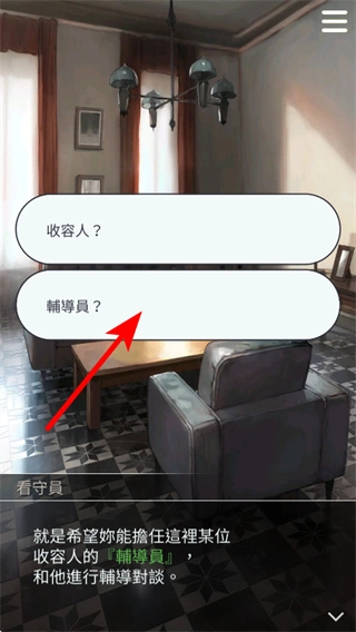 继续选取红色箭头所指的对话选项(例如辅导员),对角色的信息做出回应,以此进一步了解剧情设定。