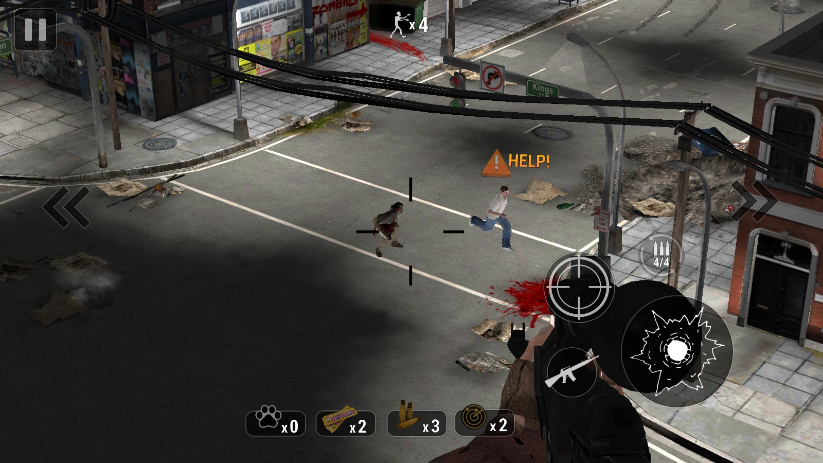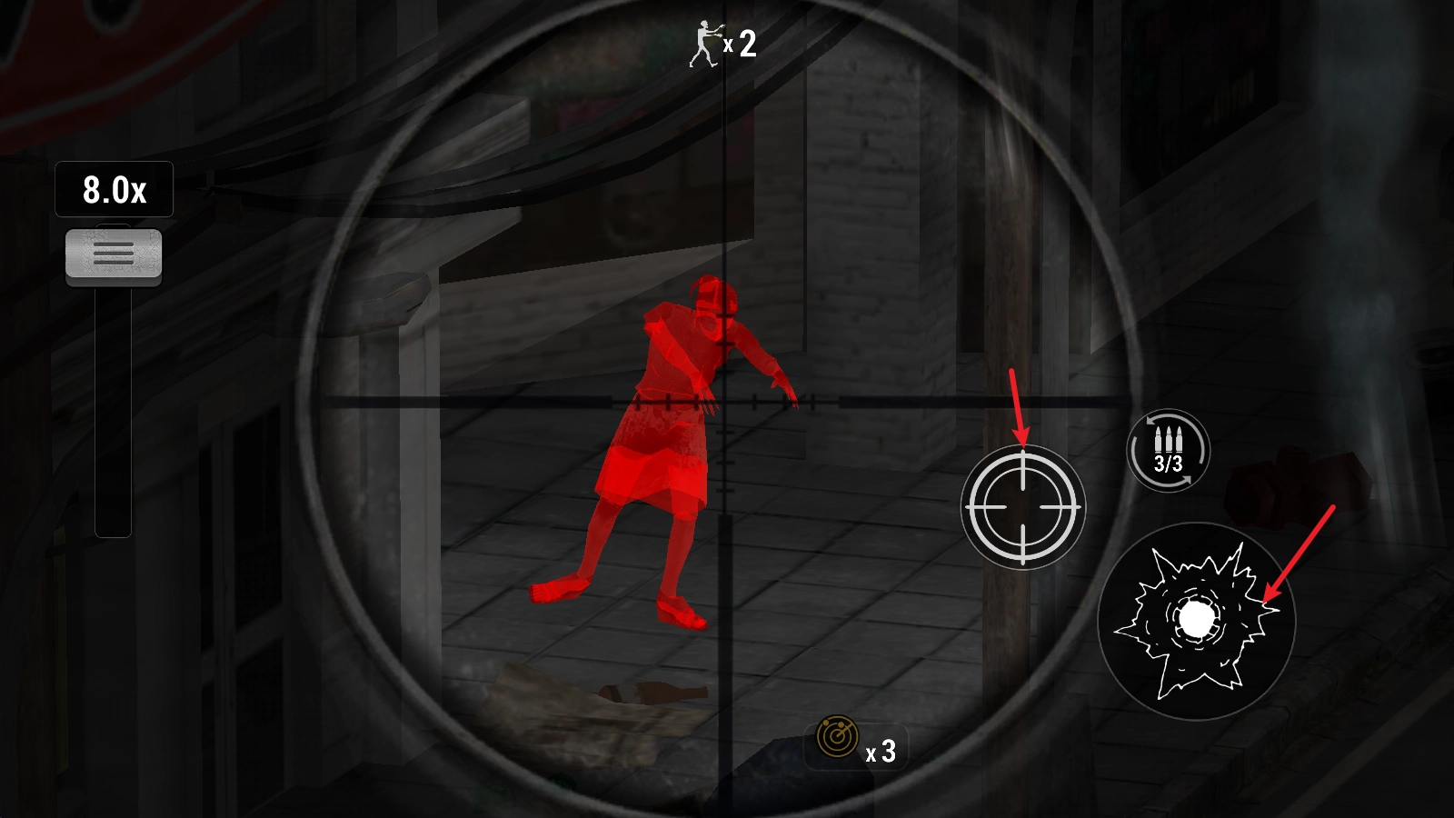 在关卡里,我们点击右侧的瞄准镜就能瞄准僵尸,再点旁边的按钮就能开火。