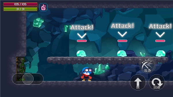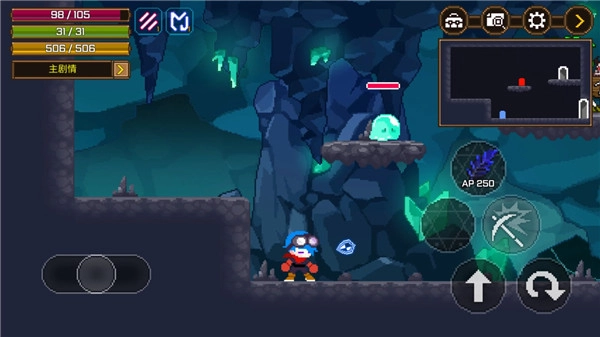 用矿镐近距离攻击怪物,借助走位和技能避开弹幕攻击,消灭敌人能恢复AP。