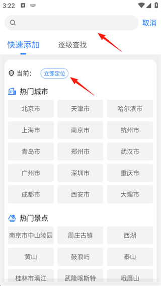 接着,您可以在搜索框里输入想要查看天气的城市进行搜索,也能在下方通过滑动的方式手动查找,另外还可以查询热门景点的天气情况。