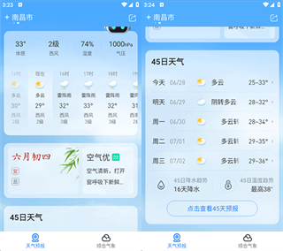 完成操作后返回首页,这里会呈现您所关注地区的24小时实时天气信息以及45日的超前天气预报。