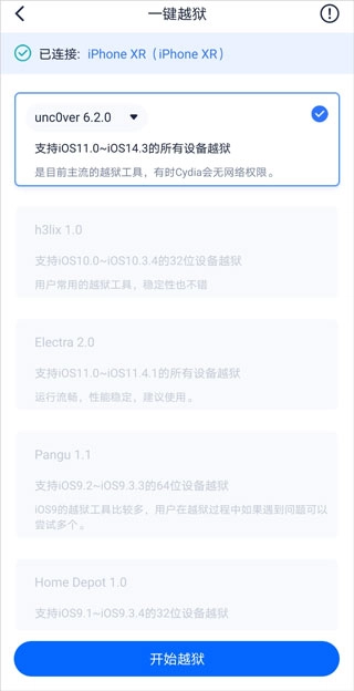 要是当前有iPhone能支持的越狱工具,它会在应用界面里自动显示出来。你勾选之后点击“开始越狱”,然后耐心等一下越狱工具安装好,安装完成就能在iPhone上打开这个越狱工具运行了。