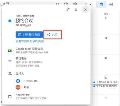 一、在Google日历里找到之前创建好的“预约安排”,点击“打开预约页面”右侧的“共享”按钮