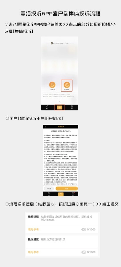 客户端:黑猫投诉>>点击底部的发起投诉按钮>>选择【集体投诉】>>同意《黑猫投诉平台用户协议》>>填写投诉信息(维权建议和投诉进度需填写其中一项)>>点击提交>>发起成功。