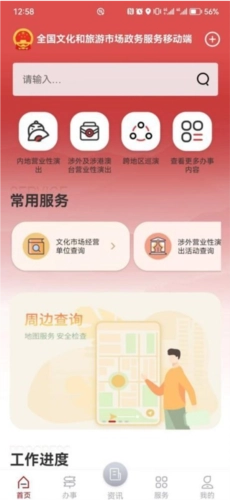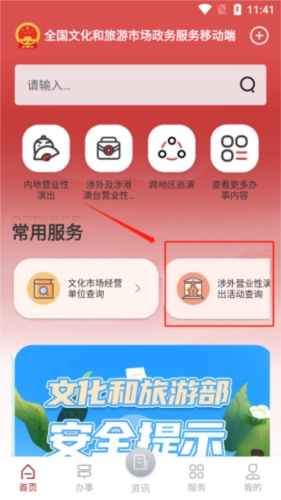 用户首先登录并打开应用,进入首页后,在常用服务板块里找到“涉外营业性演出活动查询”这一功能。