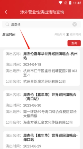 可以查询某段时间内演出的名称、场所和时间,也能通过搜索栏搜索演出活动的名称。