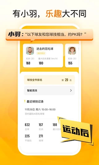 智能助手“小羽”承担运动全程的陪伴职责,从前期的组局、订场、约人,到活动中的记录分析,再到活动后生成报告并发起新挑战,它把原本分散的各个环节衔接成连贯顺畅的体验。