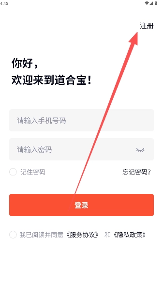 进入道合宝登录界面,右上方就是注册选项。