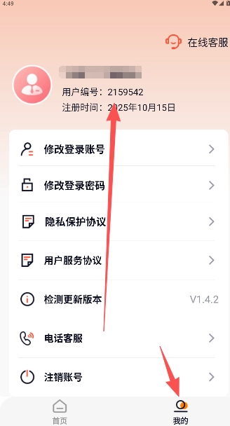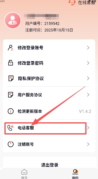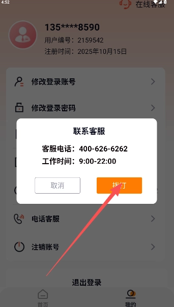 注册登录后,进入个人页面,点击下方功能区的电话客服选项。
