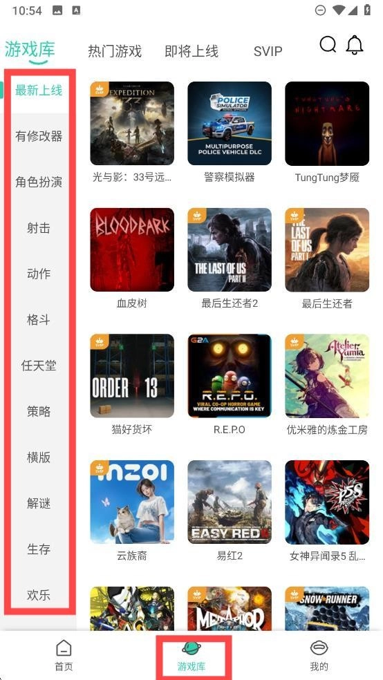 点击位于中间位置的游戏库按钮,这里整齐排列着各类游戏分类,能让你更方便地挑选游戏。