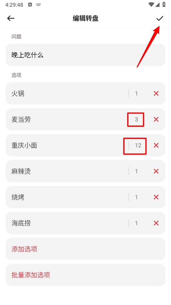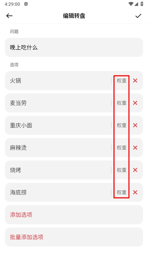 如图,可依据个人需求对转盘概率进行相应设置,点击右上角的“对钩”按钮即可完成操作。