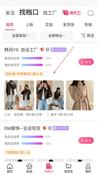 在找档口的页面里,挑选你感兴趣的档口,比如【韩YXX.自设工厂】,然后进入该档口的详情页面。