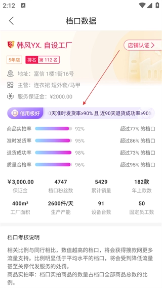 在档口数据页面,能够查看该档口的信用状况、商品实拍率、准时发货率等具体数据。