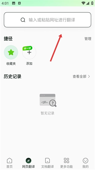 点击【网页翻译】功能,在对应的搜索框中输入或者粘贴需要翻译的网址,这样就能对该网页的内容进行翻译处理,帮助你轻松地浏览外文网页了。