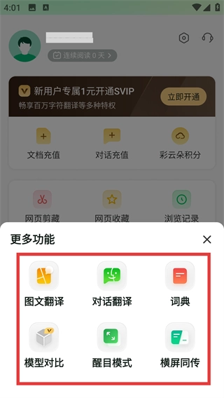 点击【更多功能】,就能使用【图文翻译】、【对话翻译】等多种特色功能,满足不同翻译需求,非常实用。