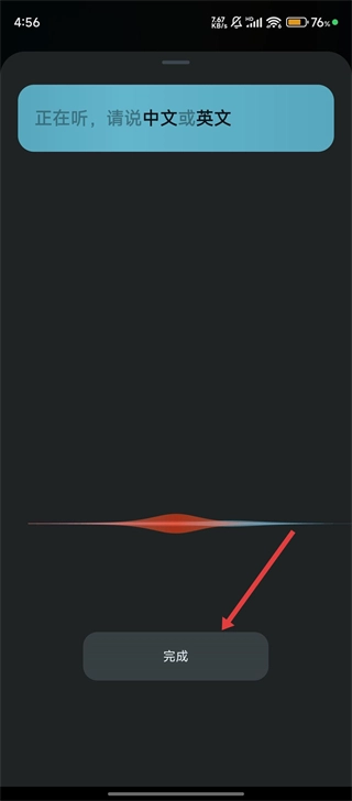 在获得权限许可后,您可以对着手机说出需要翻译的内容,待表述完毕后点击【完成】按钮,系统便会启动对语音信息的处理流程。