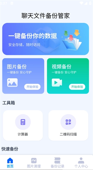 在首页就能看到图片备份、视频备份、计算器这类功能。