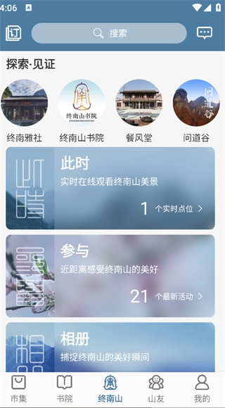 提供了丰富多样的美景、生活、活动以及美图和影片资源,用户可以查看终南山的自然风光、历史文化遗迹。