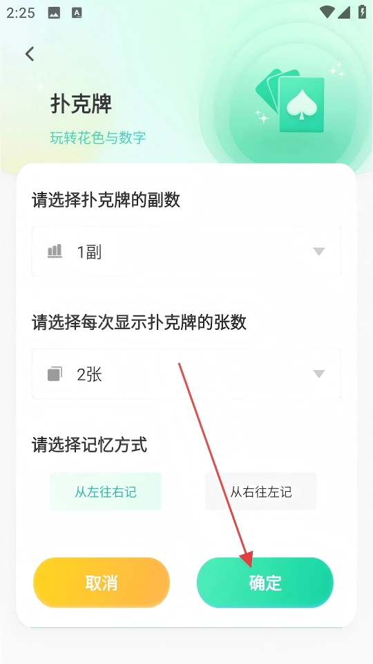 在扑克牌设置界面,选定参数后点击【确定】按钮,即可进入扑克牌训练界面。