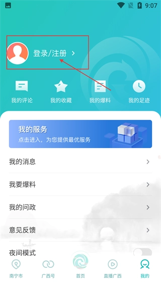 进入【我的】页面后,找到页面顶部的【登录/注册】按钮,点击该按钮就能进入登录注册界面了。