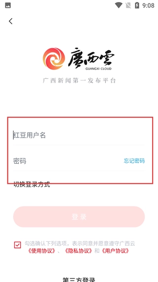 若需要更换登录方式,点击【切换登录方式】按钮,就能选择【红豆用户名】加【密码】的登录形式。