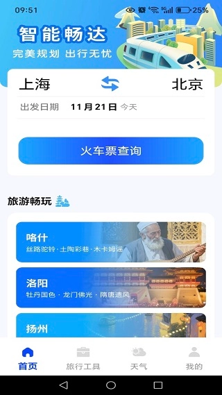 进入首页后,我们可以使用火车票查询功能,同时也能浏览旅游畅玩板块的信息分享。