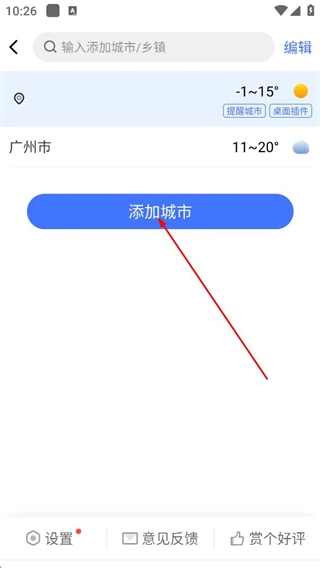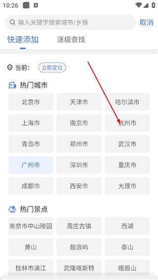 在城市管理页面,点击添加城市按钮,即可进入城市选择界面。